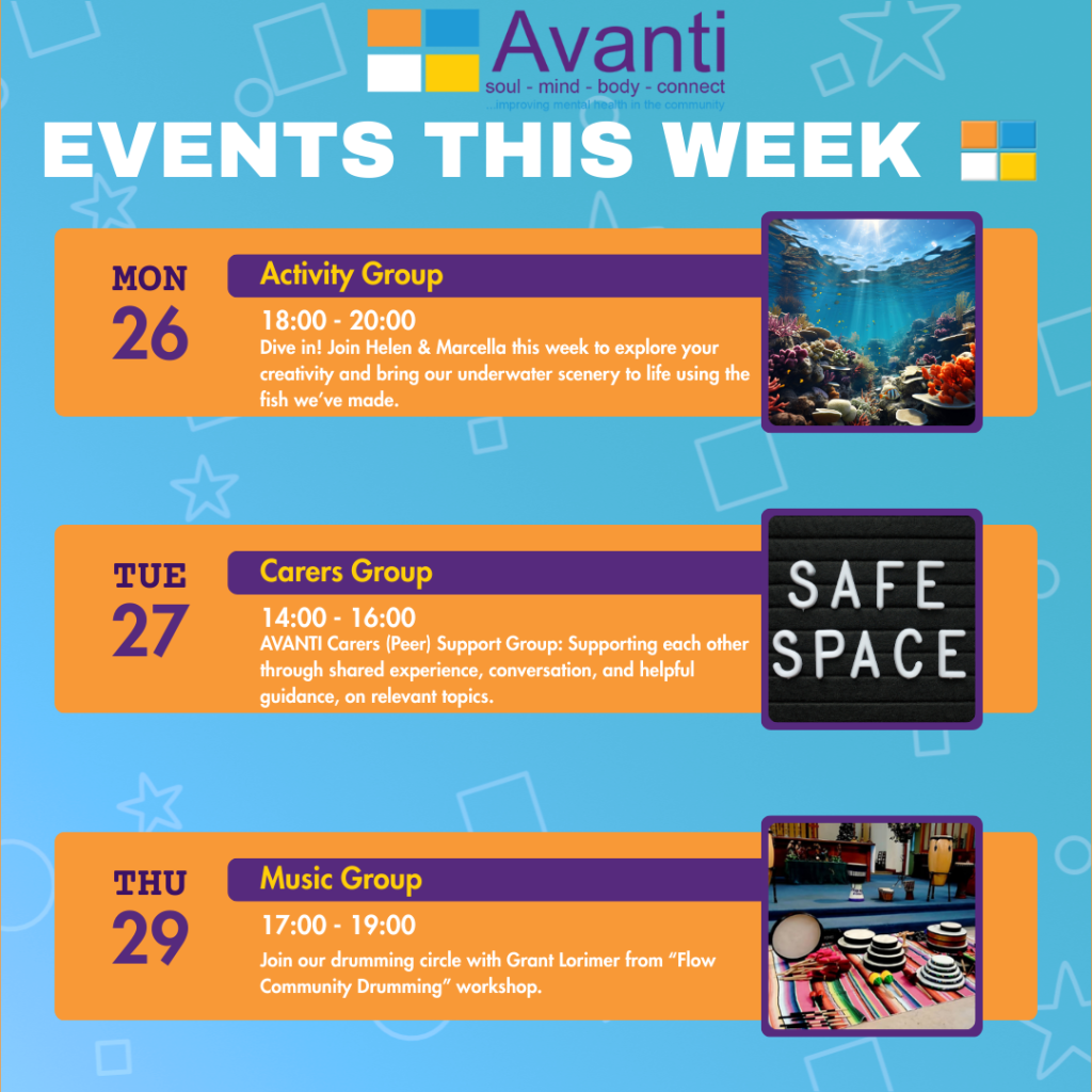 All sessions are free and drop-in once you’ve registered with Avanti, so you can attend whenever it works for you. The environment is relaxed and friendly, with a range of activities that encourage creativity and help you explore new interests.
