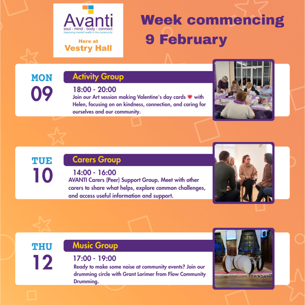 Avanti offers a supportive, welcoming space for adults experiencing mental health challenges and unpaid carers to connect, recharge, and take positive steps forward in a relaxed setting.