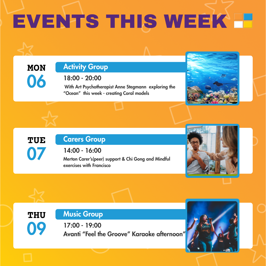 We  offer funded  weekly support and activity  groups for adults  with mental health and wellbeing needs, living in Merton and neighbouring boroughs, as well as a  weekly (peer) support group for carers who find their caring role particularly challenging.