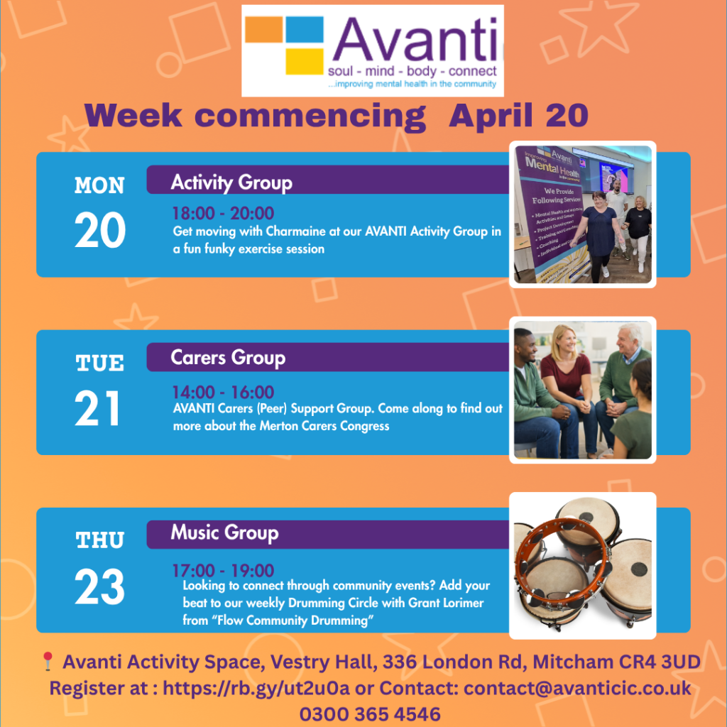 • Carers Group – find out more about the Merton Carers Congress at our AVANTI Carers (Peer) Support Group (Tue 14:00–16:00)